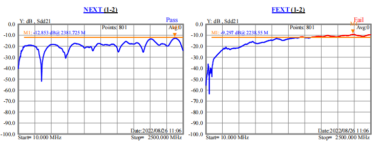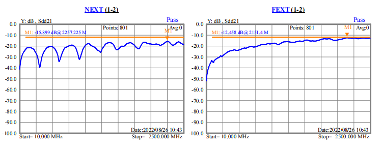 從圖一與圖二數據可以看出,不貼復合鋁箔,近串-12.8db,遠串-9.2db(如圖五);貼上復合鋁箔后,線纜的近串-15.9db,遠串-12.4db(如圖六)。因此,單面貼復合鋁箔比不貼復合鋁箔的串音效果更好。